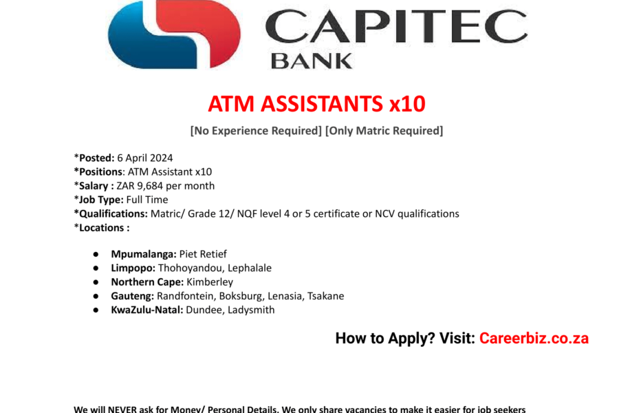 We are actively seeking vibrant, self-motivated individuals to join our team and contribute to the dynamic environment of the banking industry. If you are passionate about delivering exceptional service and eager to be part of our journey, we invite you to apply for the following positions: If you are ready to embark on a journey … Continue reading Capitec ATM Assistant positions x10