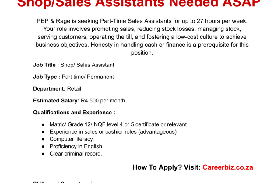 Job Description:PEP & Rage is seeking Part-Time Sales Assistants for up to 27 hours per week. As a member of the team, you’ll be known as a Dynamo – someone who works hard, has fun, and takes ownership of their tasks. Your role involves promoting sales, reducing stock losses, managing stock, serving customers, operating the … Continue reading PEP & Rage Shop/Sales Assistants needed ASAP